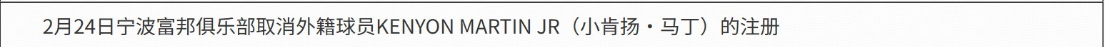 据CBA官方最新注册信息显示,宁波富邦取消注册小肯扬-马丁。