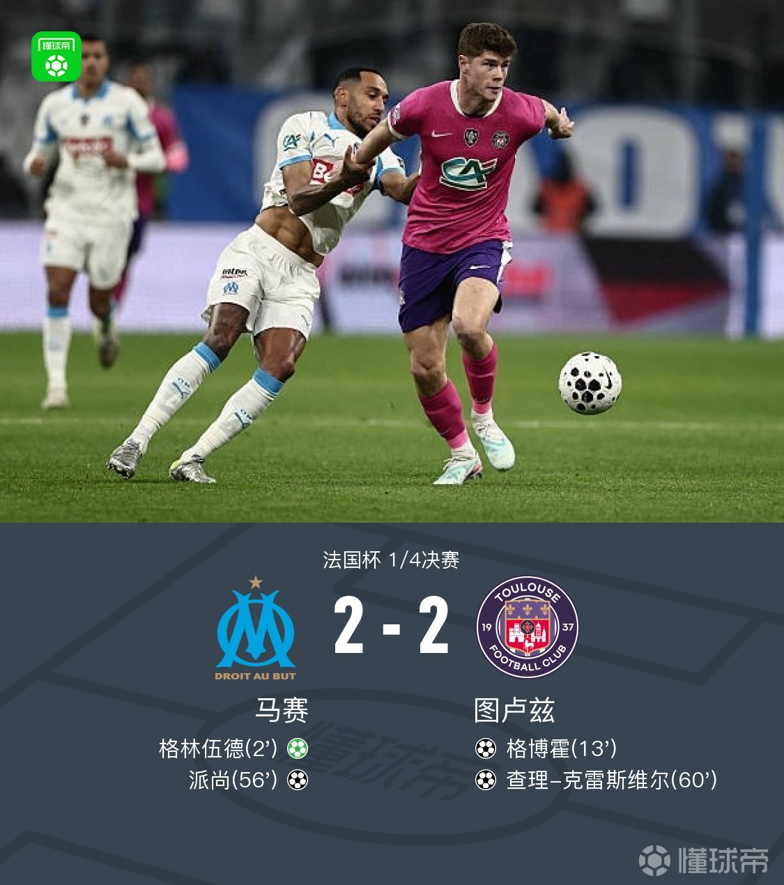 北京时间3月5日法国杯 1/4决赛,马赛对阵图卢兹。马赛格林伍德破门,派尚破门。图卢兹格博霍破门,查理-克雷斯维尔破门。最终比分马赛 2-2 图卢兹。
