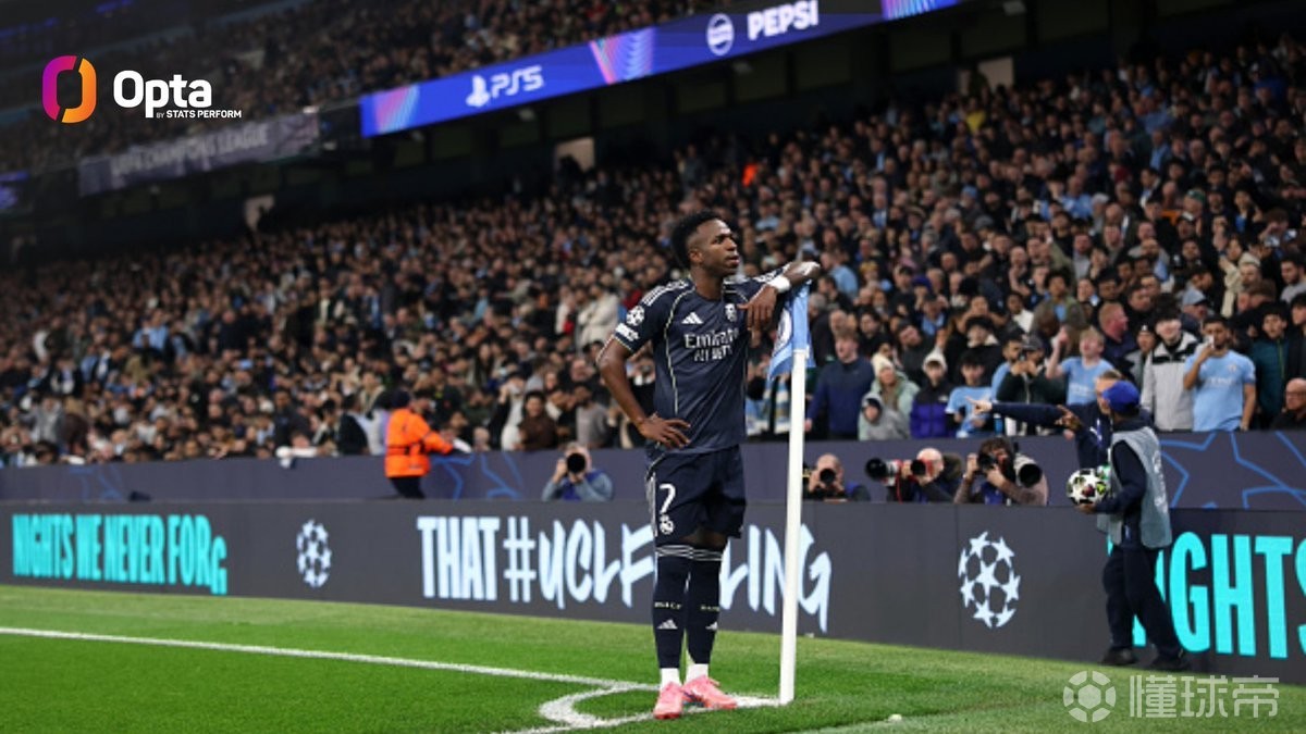 维尼修斯欧冠对阵曼城参与8球,仅次于梅西