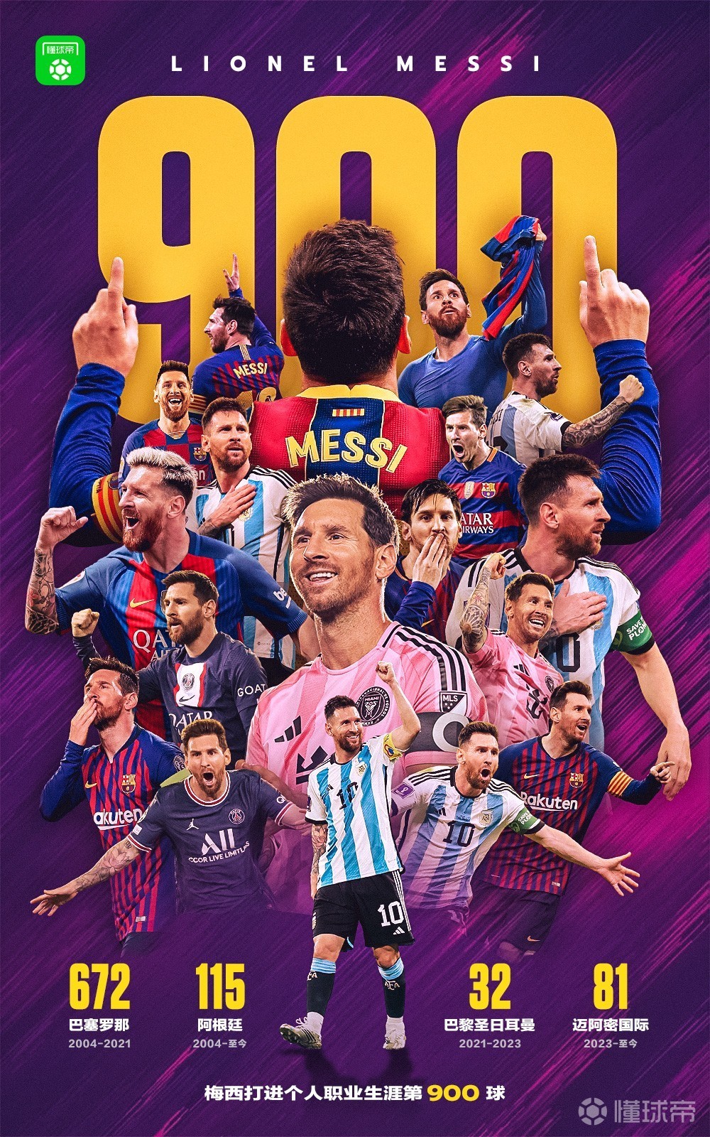 此役主场对阵纳什维尔,梅西在比赛第7分钟破门,帮助迈阿密国际取得1-0领先,这是38岁的梅西职业生涯第1142场比赛中打入的第900球。