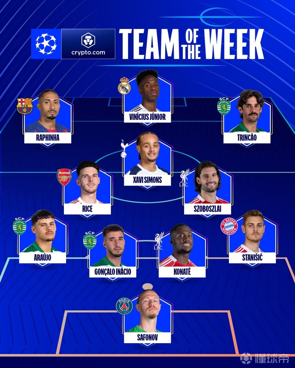 欧冠本周最佳阵容:维尼修斯、拉菲尼亚、索博、赖斯等人在列
